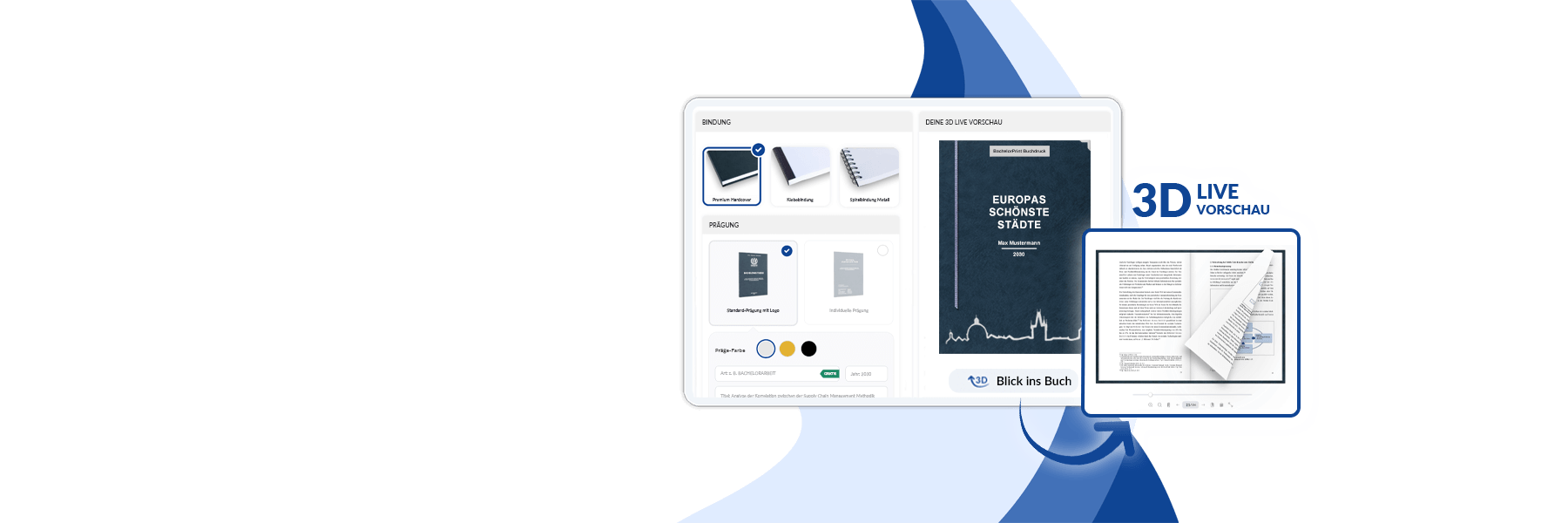 Und falls du dir unsicher darüber bist, wie deine fertige Bindung aussehen wird, musst du dir ebenfalls keine Gedanken machen. Dank der Live-Vorschau und der „Blick-ins-Buch“-Funktion kannst du in deinem Buch blättern und überprüfen, ob alles deinen Erwartungen entspricht.