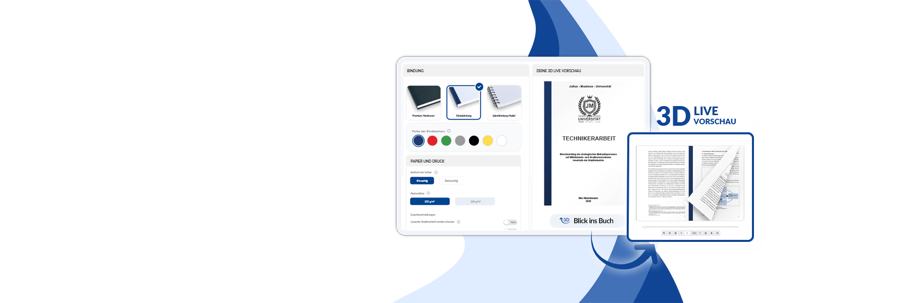 Konfiguriere die Bindung deiner Technikerarbeit individuell und nutze die 3D-Live-Vorschau, um alle Konfigurationen ansehen zu können. Zudem kannst du in unserem Online-Shop auf den Kostenrechner und den Lieferzeitenrechner zurückgreifen.